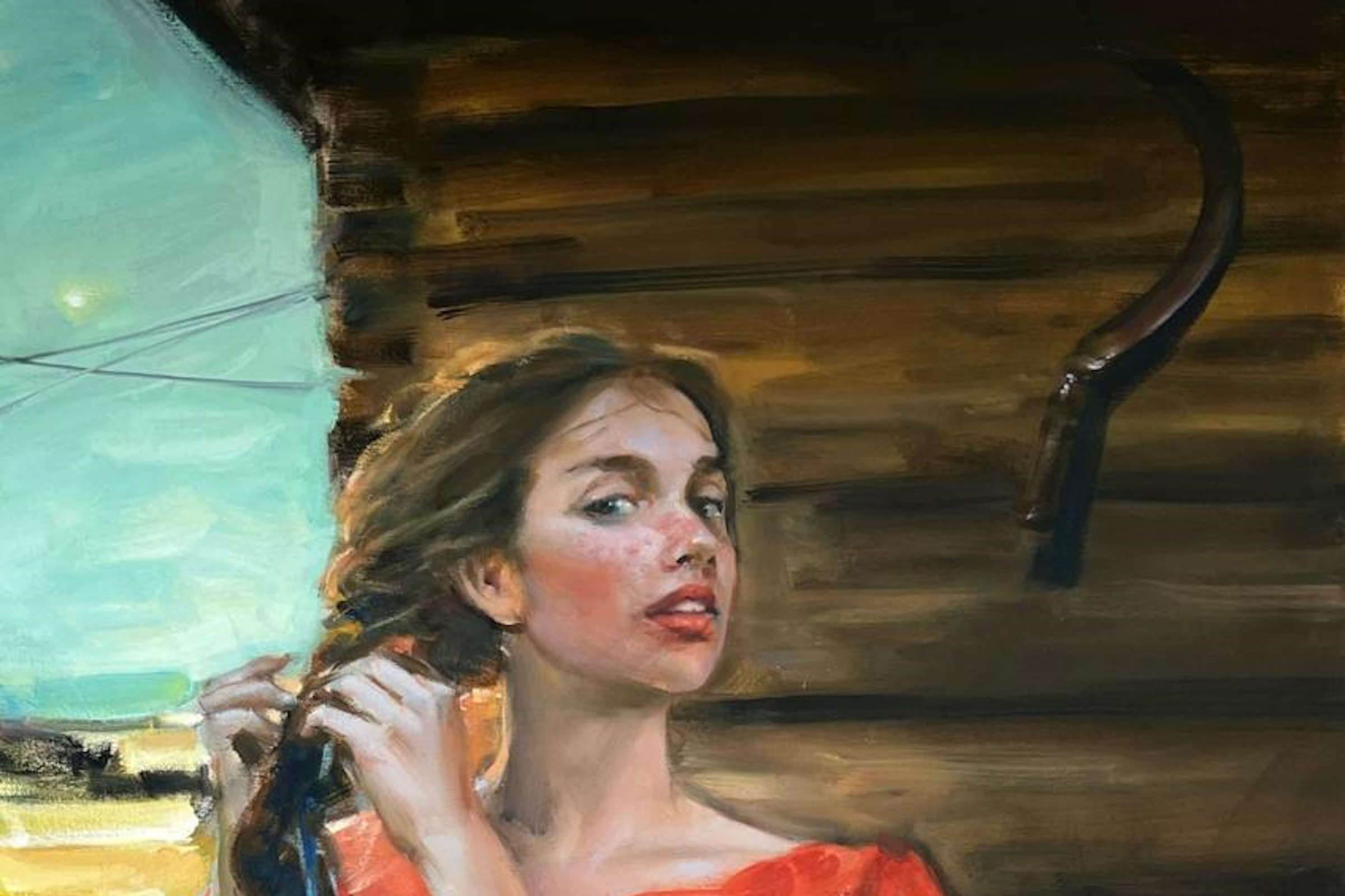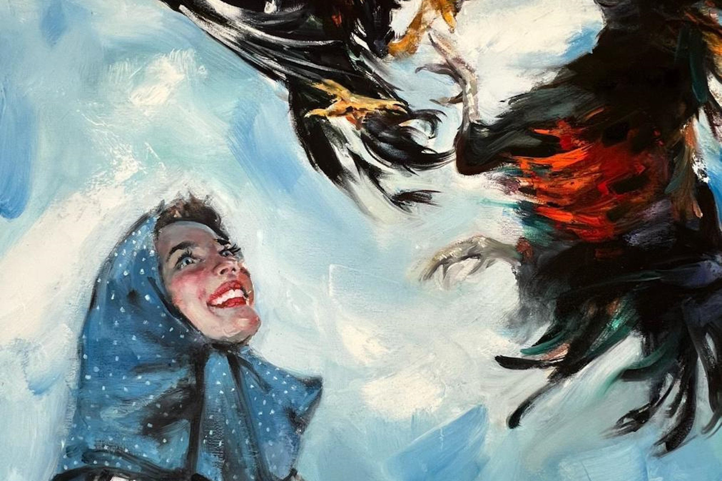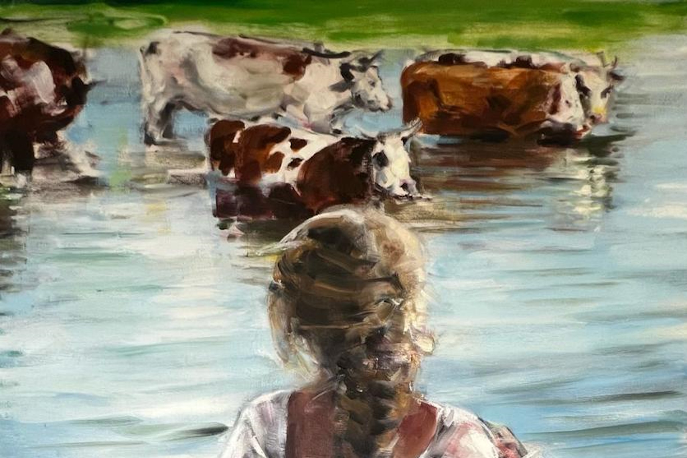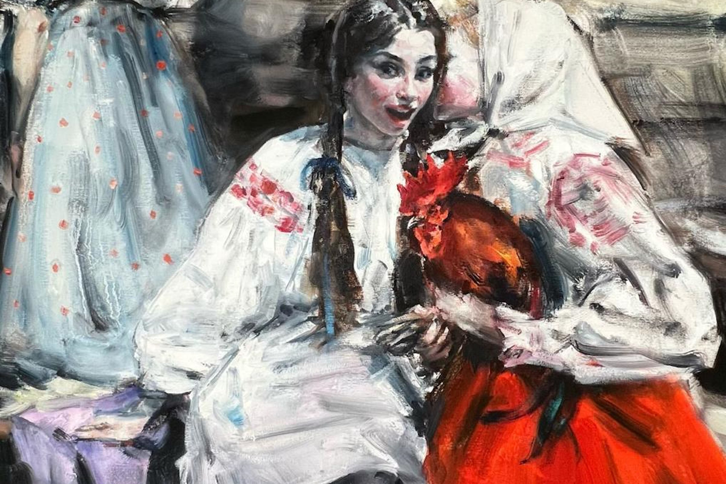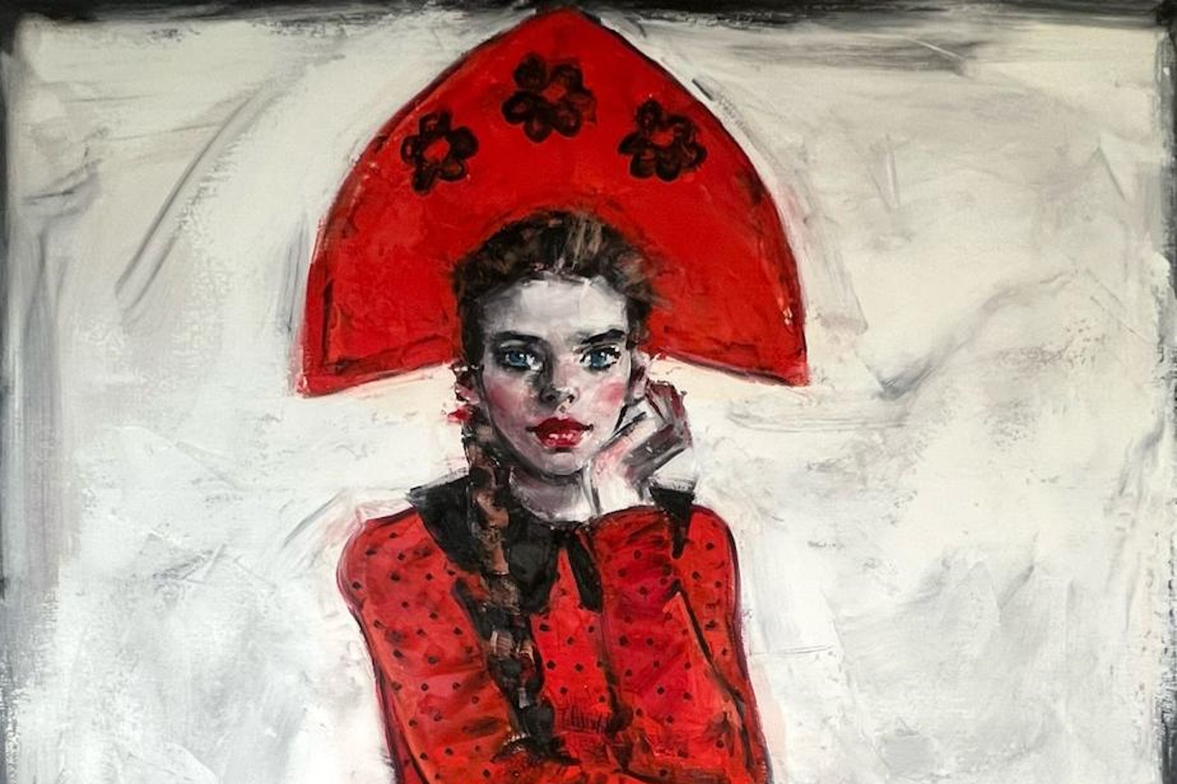 Художник смело соединяет архаику и современность, сочетает фольклор и сказочные мотивы с языком поп-культуры. Красные сарафаны и кокошники, косы с лентами, коровы, гуси, петухи, леденцы-петушки и красные сапожки – всё это живописная лексика выставки.