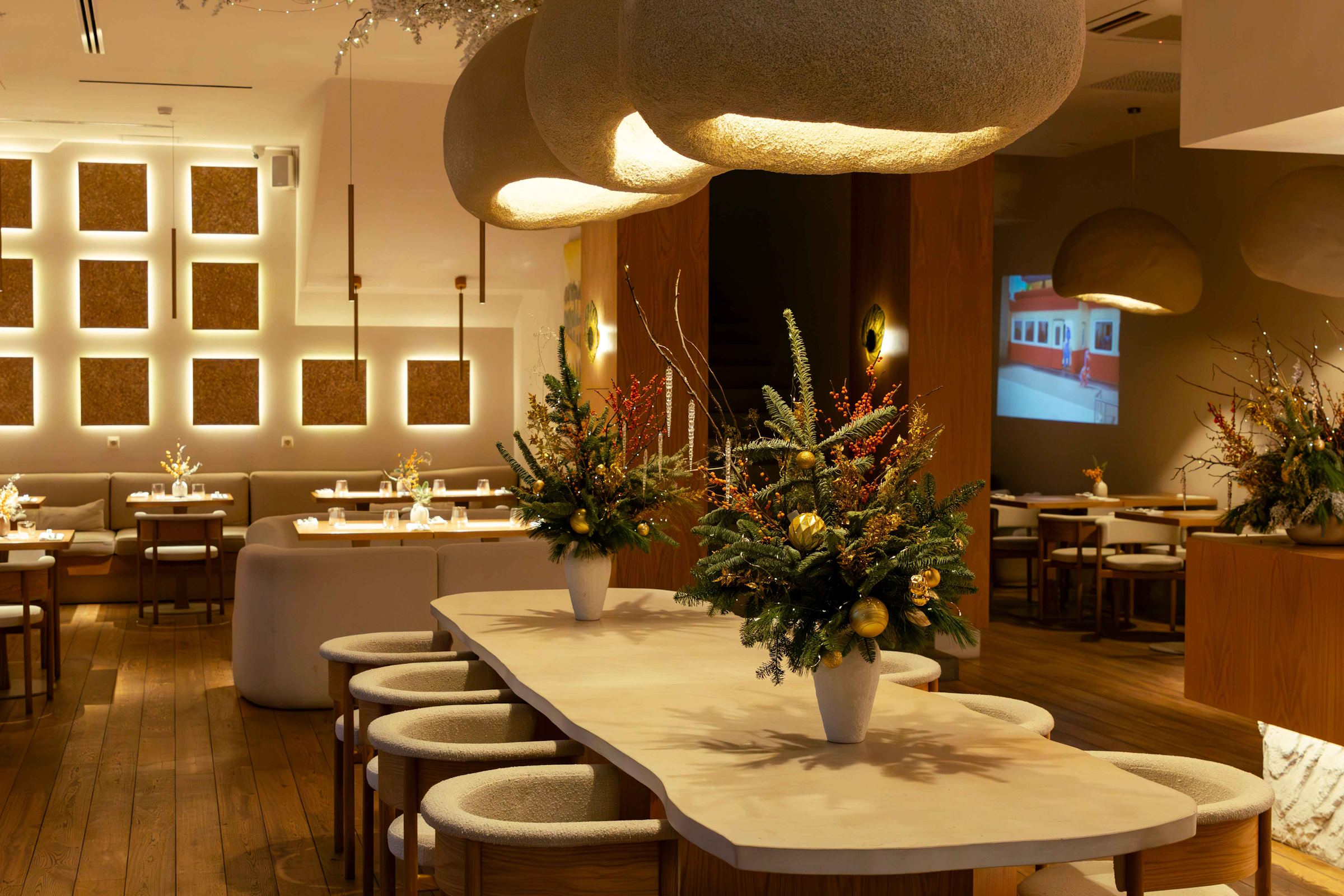 Интерьер гармонично сочетает искусство и природу. Песочные и сливочные стены выступают идеальным фоном для визуальных акцентов. Панорамные окна наполняют пространство светом, и в нем лучше проявляются текстуры ручной работы. Все внутри настроено на полное расслабление.