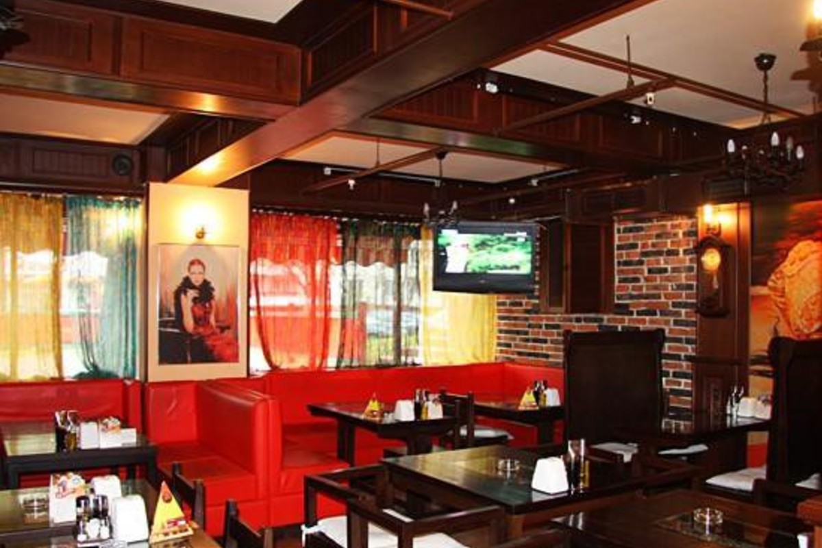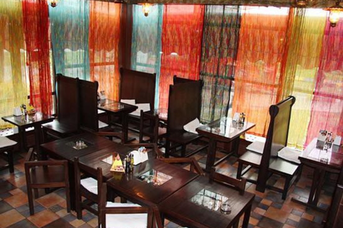 Интерьер выполнен в европейском стиле — деревянные столы, изящные кресла, светильники необычной формы, разноцветные занавески.