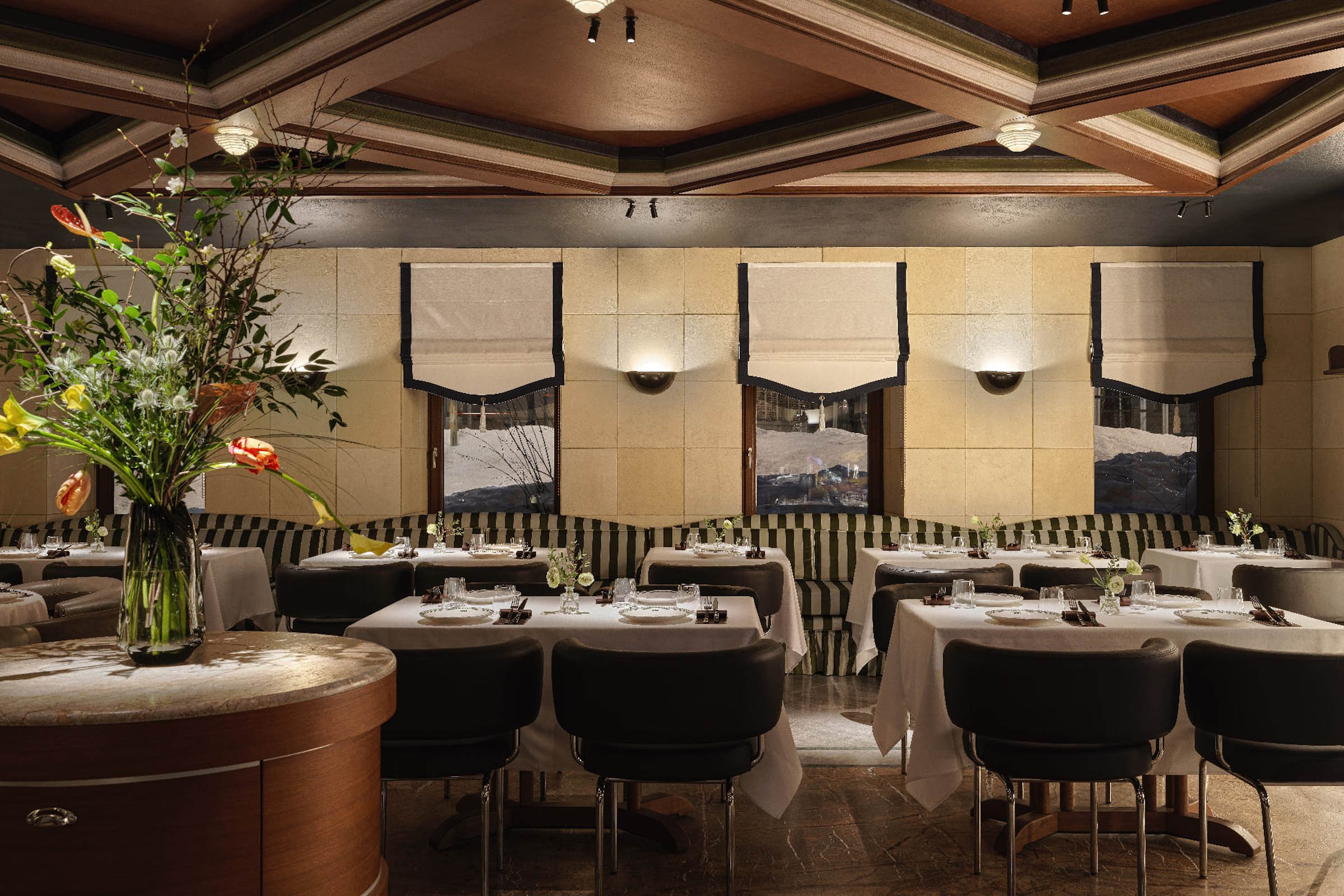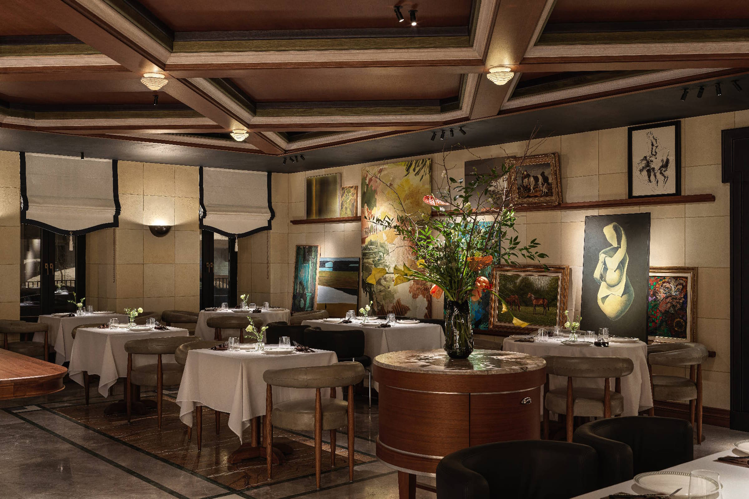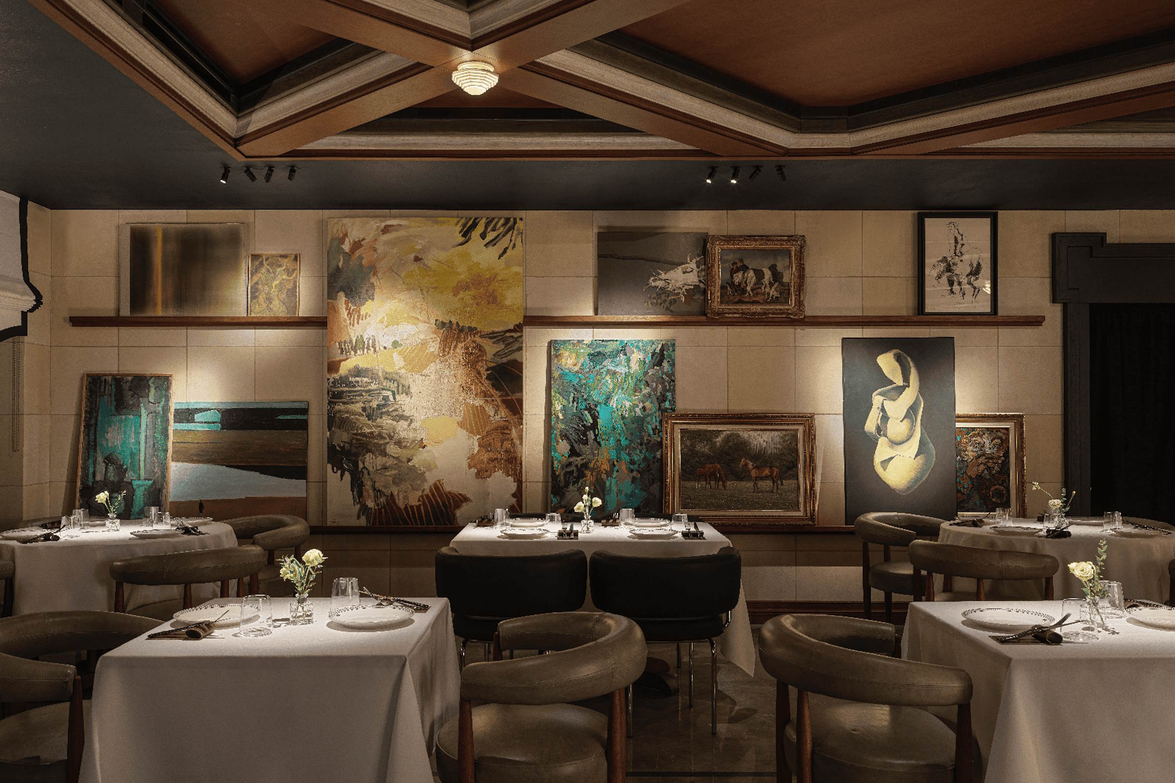 Не только гастрономическая концепция, но и интерьер, созданный дизайнером Женей Ужеговой, делают ОМА похожей на баскские txoko – мужские гастрономические клубы, где готовят еду с историей. У каждого из двух залов свой характер. Один – камерный, с расписными стенами, для особых ужинов и больших компаний. Во втором, под деревянным потолком с кессонами, атмосфера тихой роскоши и много-много искусства. Так уместный в этих стенах «Дым» известного московского дуэта Вики Бегальской и Александра Вилкина и их же пасторальные «Лемуры». Философская литография «Победа» Никиты Родионова и сюрреалистичная She Алексея Иванова. И еще столько всего, что нужно обсудить, пока вино в бокале успеет надышаться.