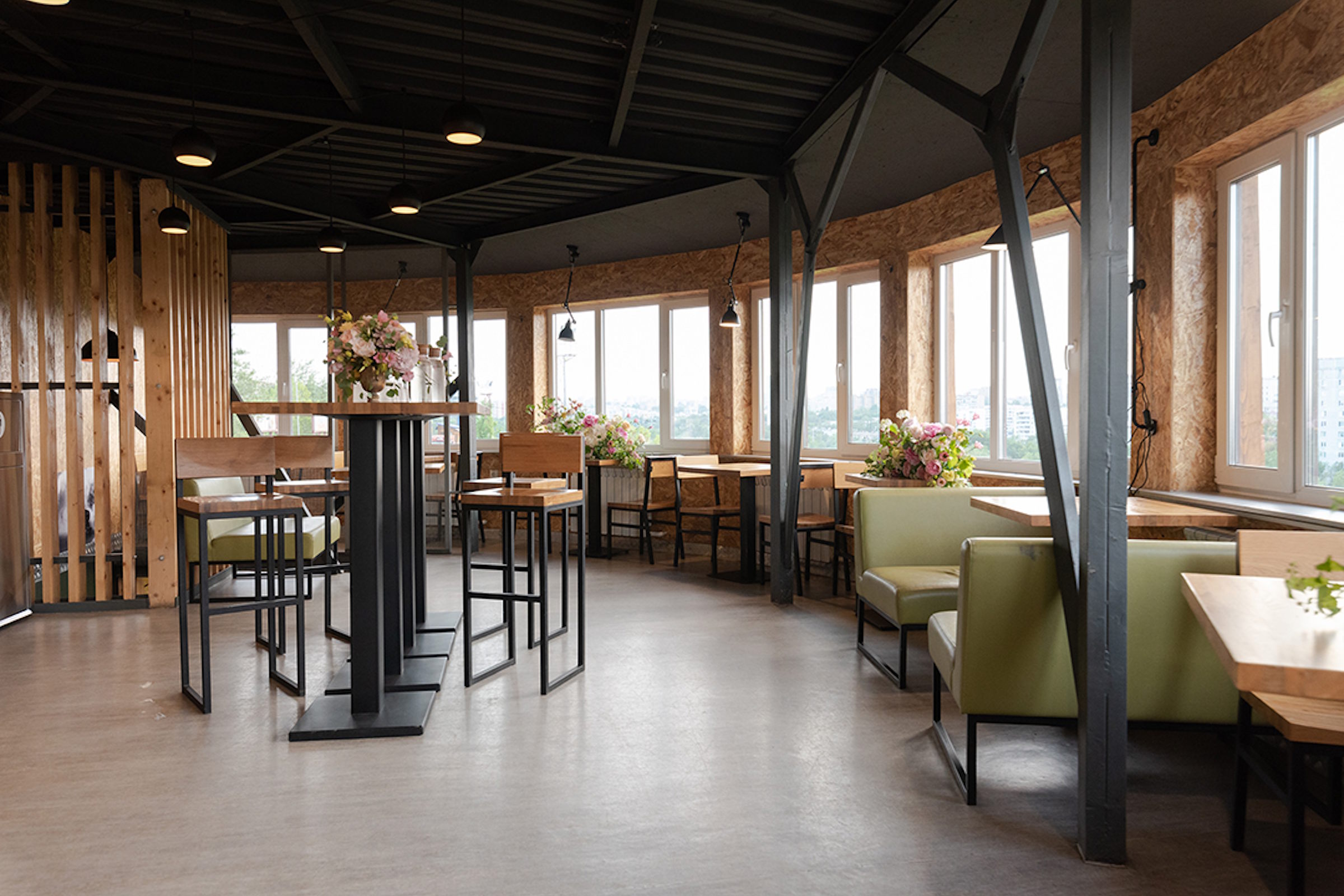 Уютный двухуровневый зал с панорамным видом, мягкие кресла, теплые пледы, живые цветы, приглушенный свет ламп, потрясающий вид на живописные склоны и альпийская кухня во всей красе.